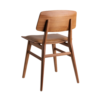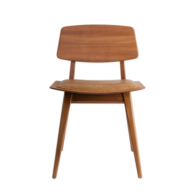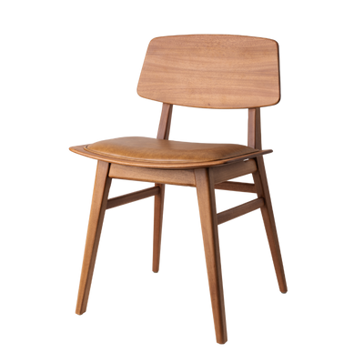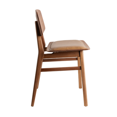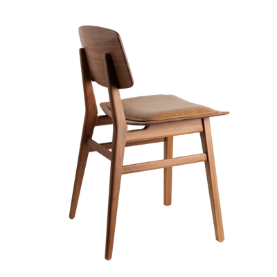Estrutura em madeira maciça. Assento (espuma D28) estofado ou multilaminado e encosto multilaminado.