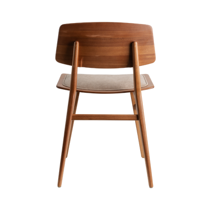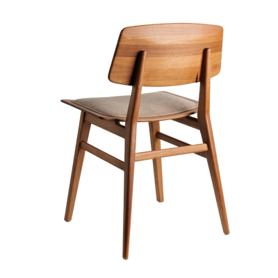 Estrutura em madeira maciça. Assento (espuma D28) estofado ou multilaminado e encosto multilaminado.