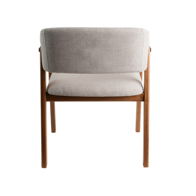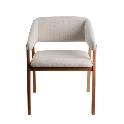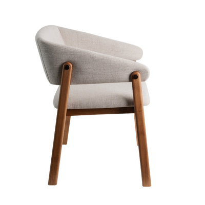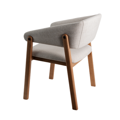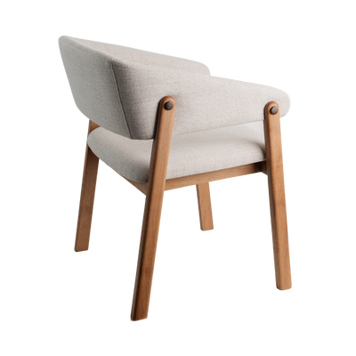 Estrutura em madeira maciça. Assento (espuma D30) e encosto (espuma D28 frente e D14 atrás) estofados.